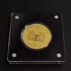 The obverse showcases the Chad coat of arms, along with the coin’s denomination, year of mintage, purity, and weight over a snakeskin pattern background.