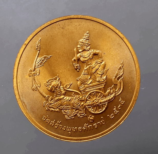 Obverse – The center of the coin features the image of His Majesty King Chulalongkorn (Rama V) in full white army uniform, wearing the sash of the Most Illustrious Order of the Crown of Thailand and the necklace of the Most Illustrious Order of the Royal House of Chakri. The image of His Majesty King Bhumibol Adulyadej (Rama V) in full royal guard uniform, wearing the sash and necklace of the Most Illustrious Order of the Royal House of Chakri, facing left. The text reads “Rama V” on the left edge of the coin and “Rama IX” on the right edge.