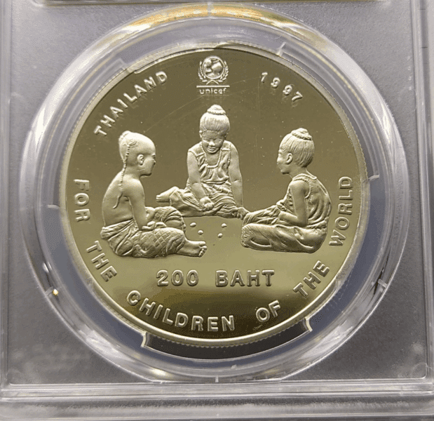 Grading coin, polished silver, 200 baht, commemorative coin for the 50th anniversary of the game of marbles, United Nations Children’s Fund (UNICEF), 2540 (1997), PR 69 DCAM PCGS.