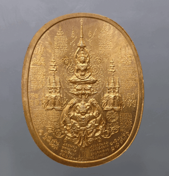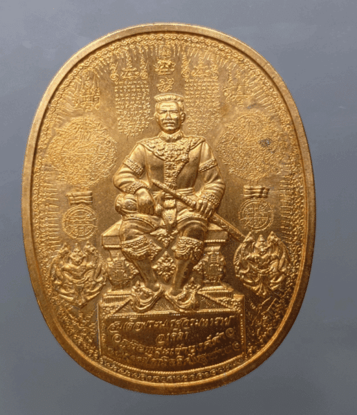 The amulet coin of King Naresuan the Great, “Black”, sitting on a large throne, “Defeat the Enemies” model, Ayutthaya Province, year 2006, copper material.