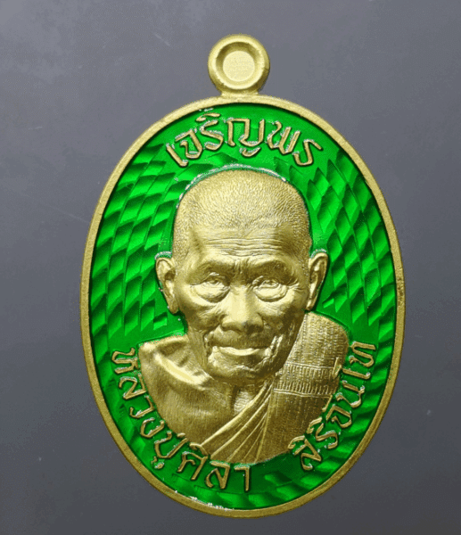 The auspicious coin of Luang Pu Sila Sirichanto (separate committee set, antique gold plated, green enamel) commemorating the 80th birthday of Dharma Uthayan, Kalasin Province, year 2024.