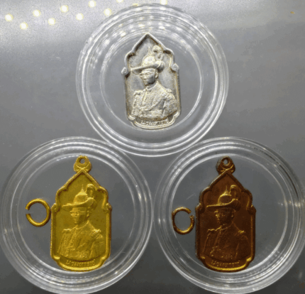 A set of three commemorative coins (silver, brass, copper) for the 5th cycle birthday anniversary of King Rama IX in 1987. Rare. Comes with a box.