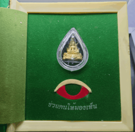 Phra Phuttha Chinnarat amulet, silver plated with gold, small size, commemorative edition for the 6th cycle birthday of King Rama IX, created by the People’s Eye Protection Foundation in 2542 BE (1999 CE), with original box.