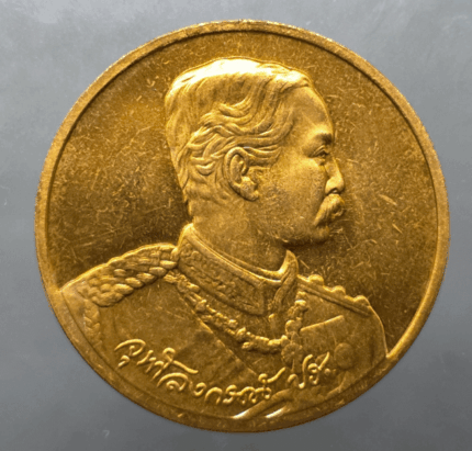 Commemorative coin on the occasion of the 90th birthday of Her Majesty Queen Srinagarindra, the Queen Mother. Obverse – The center of the coin features the image of Her Majesty Queen Srinagarindra, facing left, wearing full regalia, the sash and necklace of the Most Illustrious Order of the Chakri Dynasty, decorated with the Ratana Phorn Medal of King Rama VIII and the Ratana Phorn Medal of King Rama IX. Below is the inscription “Her Majesty Queen Srinagarindra”, surrounded by a necklace around the rim of the coin.