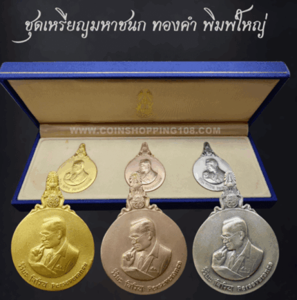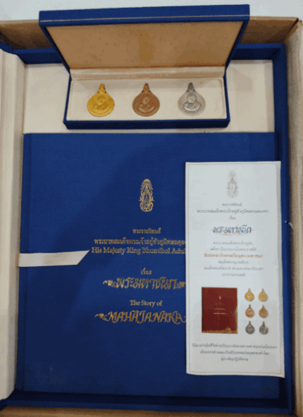 Complete set of Mahajanaka gold coins, large print (gold, silver, bronze), popular block P, missing, with book, B.E. 2539, beautiful condition, authentic, easy to see.