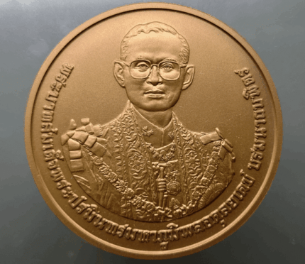 Commemorative coin on the occasion of the 90th birthday of Her Majesty Queen Srinagarindra, the Queen Mother. Obverse – The center of the coin features the image of Her Majesty Queen Srinagarindra, facing left, wearing full regalia, the sash and necklace of the Most Illustrious Order of the Chakri Dynasty, decorated with the Ratana Phorn Medal of King Rama VIII and the Ratana Phorn Medal of King Rama IX. Below is the inscription “Her Majesty Queen Srinagarindra”, surrounded by a necklace around the rim of the coin.