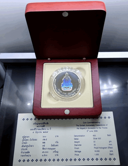Polished silver holographic coin commemorating the 60th anniversary of His Majesty’s accession to the throne, with wooden box and certificate, 2006.