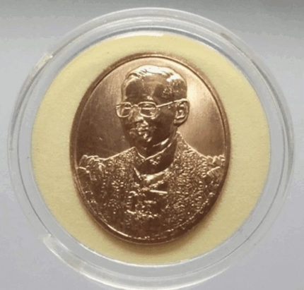 King Rama IX’s portrait, pure gold, commemorative of the Golden Jubilee, 1996, 97.66% gold plate, with stand and original box.