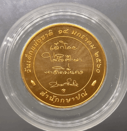 Commemorative coin on the occasion of the 90th birthday of Her Majesty Queen Srinagarindra, the Queen Mother. Obverse – The center of the coin features the image of Her Majesty Queen Srinagarindra, facing left, wearing full regalia, the sash and necklace of the Most Illustrious Order of the Chakri Dynasty, decorated with the Ratana Phorn Medal of King Rama VIII and the Ratana Phorn Medal of King Rama IX. Below is the inscription “Her Majesty Queen Srinagarindra”, surrounded by a necklace around the rim of the coin.