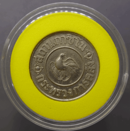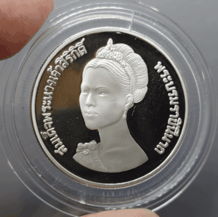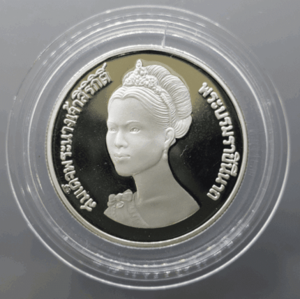 Commemorative coin on the occasion of the 90th birthday of Her Majesty Queen Srinagarindra, the Queen Mother. Obverse – The center of the coin features the image of Her Majesty Queen Srinagarindra, facing left, wearing full regalia, the sash and necklace of the Most Illustrious Order of the Chakri Dynasty, decorated with the Ratana Phorn Medal of King Rama VIII and the Ratana Phorn Medal of King Rama IX. Below is the inscription “Her Majesty Queen Srinagarindra”, surrounded by a necklace around the rim of the coin.