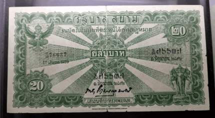 20 Baht banknote, Series 2, Ploughing Scene, 1928. Used, cleaned, in good condition with slight fading. Rare.