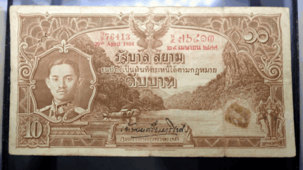 10 baht banknote, type 3, issue 1, from the reign of King Rama VII, 1934, used, repaired