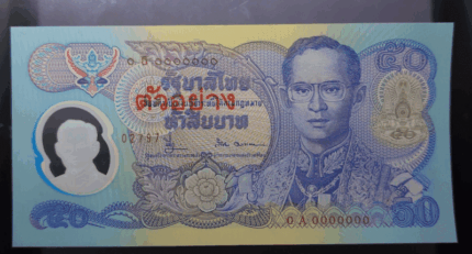 Sample banknote, 50 baht commemorative banknote, King Rama IX’s 50th anniversary of accession to the throne, Golden Jubilee, 1996