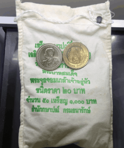 A bag of 50 coins, 20 baht nickel coins, commemorative coins for the 150th anniversary of the birth of King Chulalongkorn, Rama V, 2003, uncirculated.