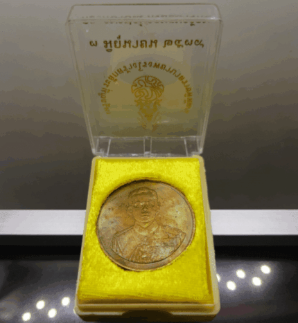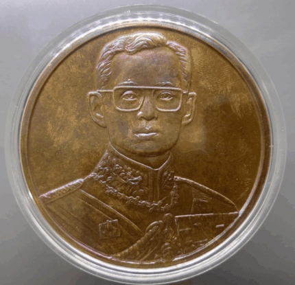 Bronze coin commemorating the construction of Rajaphibat Hospital, image of King Rama IX, back side B.P.R., size 3 cm, year 1996, original case