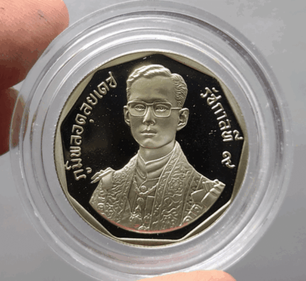 Front – In the center of the coin is the image of Her Majesty Queen Sri Nakarindra, facing left, dressed in full regalia, wearing the sash and necklace of the Most Illustrious Order of the Royal Household.