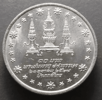 Reverse – The center of the coin features the royal emblem of Her Majesty Queen Srinagarindra, the Princess Mother, consisting of the royal crown, placed on a two-tiered tray above a stand, with a five-tiered lotus-petal umbrella on either side. Below the royal emblem is the denomination and the words “84th Birthday”, “21 October 1984”, “Thailand”. Along the edge of the coin are large and small lotus flowers, alternating in a pattern.