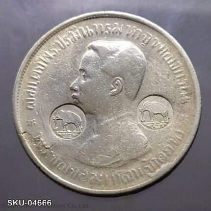 Thailand Coat of arms, 1 Baht Silver Coin-Trademark stamped coin, Siam Elephant, Rama V