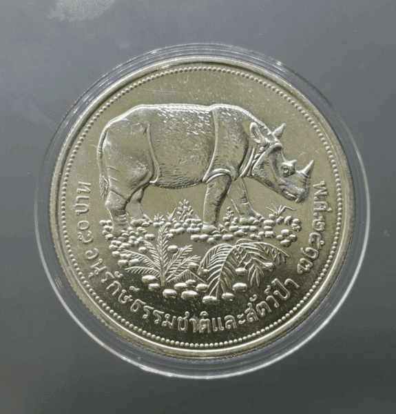 50 baht silver coin, commemorative, nature and wildlife conservation, Sumatran rhinoceros, 1974