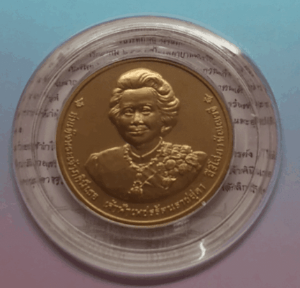 Back – The center of the coin features the royal seal of His Majesty King Bhumibol Adulyadej. Below is the price inscription. Near the top edge of the coin is the inscription “Maha Mongkol Chaiyapansa 60th Birthday”. Below is the inscription “5 December 1987, Thailand”. There is a floral pattern separating the text above and below.