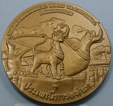 Back – The center of the coin features the royal seal of His Majesty King Bhumibol Adulyadej. Below is the price inscription. Near the top edge of the coin is the inscription “Maha Mongkol Chaiyapansa 60th Birthday”. Below is the inscription “5 December 1987, Thailand”. There is a floral pattern separating the text above and below.