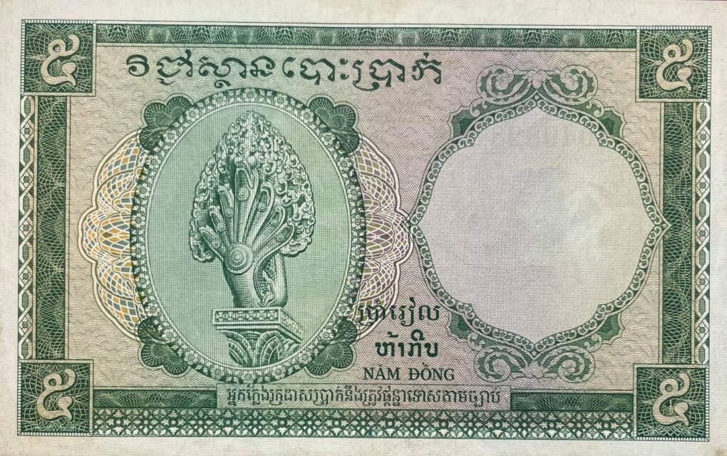 Design features green on pink and green underprint. On the front, banana trees at left, palms at right. The back shows Naga (mythical snake) head at left side.