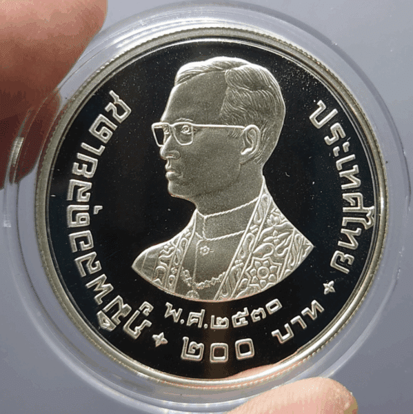 with certificate. Beautiful condition , rare. Rare certificate. Features: Round coin with serrated edge. Obverse : Portrait of His Majesty King Bhumibol Adulyadej, facing left, wearing royal regalia and robes. Below the portrait is the inscription “B.E. 2530” (1987). Near the left edge of the coin is the inscription… The front of the coin features the image of King Bhumibol Adulyadej on the right, with the text “Thailand” below, indicating the price “200 Baht,” separated by a floral motif. The back of the coin depicts two pheasants in the center, with branches and leaves as part of the background. Around the top edge is the text “WWF 25th ANNIVERSARY,” and around the bottom is “200 BAHT 1987 THAILAND,” separated by a circular dot. This is a 200 Baht coin. |
