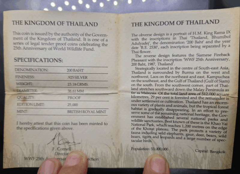 200 Baht polished silver commemorative coin, 25th Anniversary of the World Wildlife Fund, Pheasant design, 1987, with certificate. Excellent condition.
