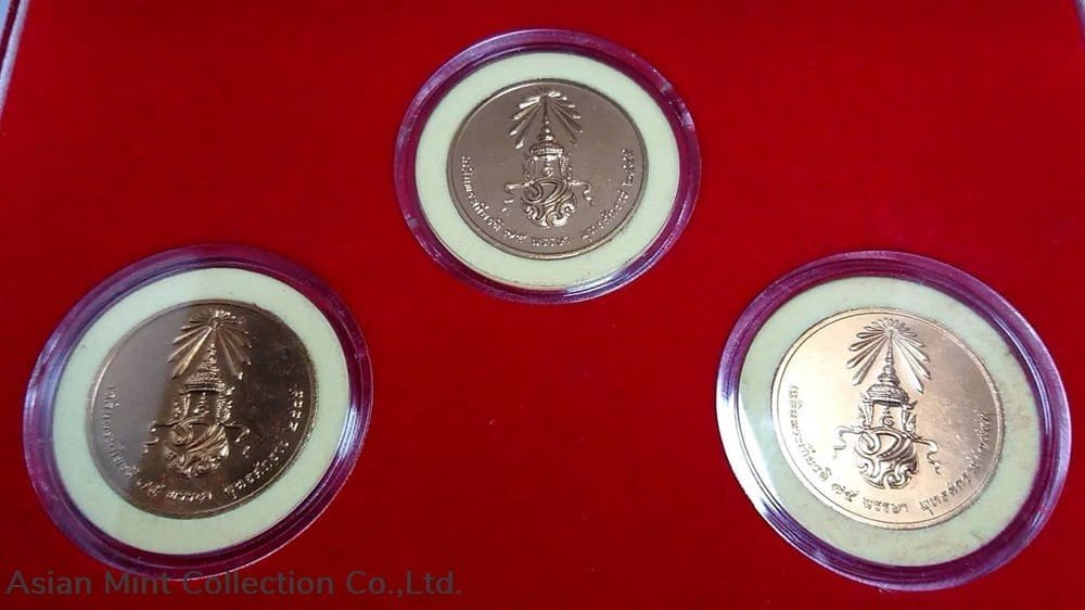 The Emerald Buddha-Bronze medal set of 3 seasons, the King’s 75th birthday by Treasury department in 2002Complete set of 3 coins, 3 season shape, with red box, rare, good coin, big ceremony, worthy of worship. Made a small amount.