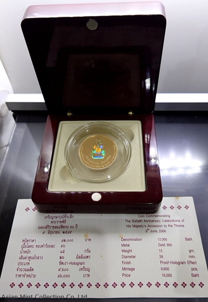 Commemorative Polished Gold coin – Hologram, coin face 12000 baht, commemorating the 60th Anniversary of His Majesty the King’s accession to the throne in 2006 with a wood box and certificate of product  SPECIFICATIONGold material, polished, HologramWeight: 15 gramsSize: 26 millimetersMintage: 9600 coinsIngredients: 90% GoldCertificate COA: YesBox: Yes