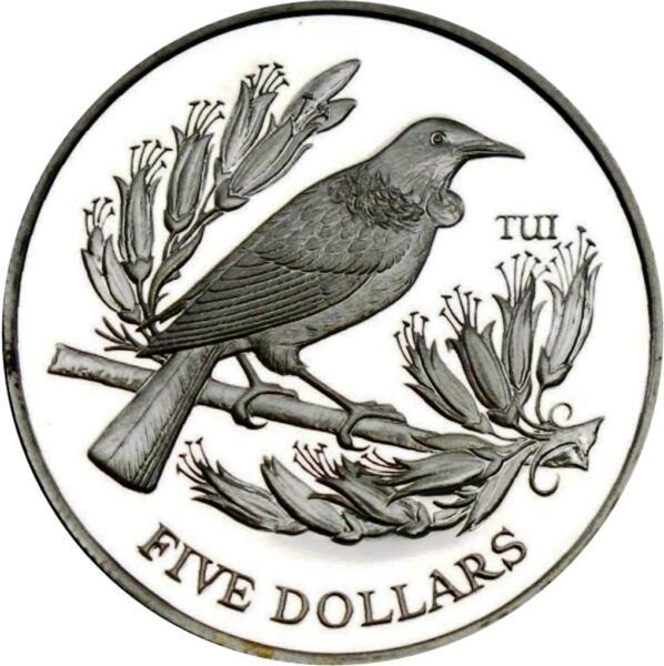 1995 New Zealand Five Dollar Silver Proof Coin Queen Elizabeth II Tui Bird