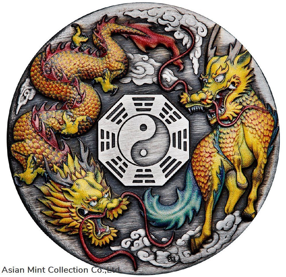 2022 2oz Dragon and Qilin with Bagua Silver Antiqued Coloured Coin