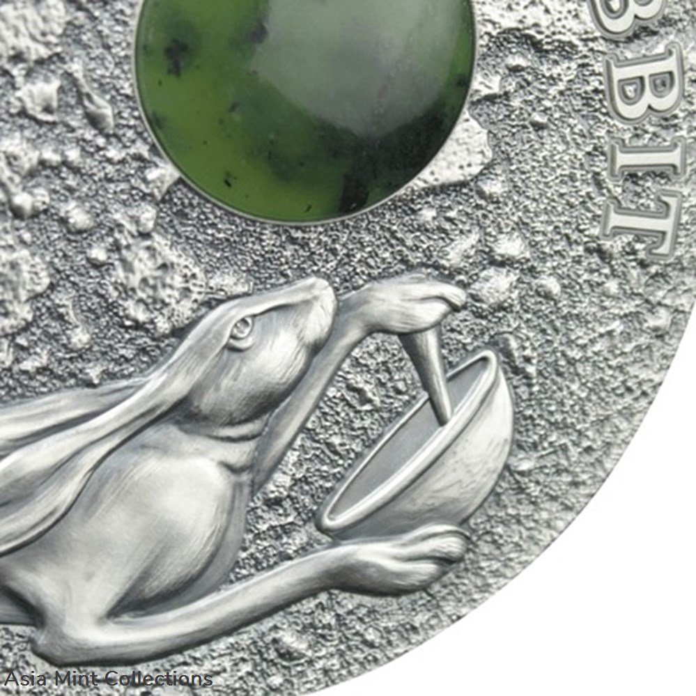 The coin tells us one Chinese legend about the adorable Rabbit on the Moon. The Moon Rabbit is a mythical figure who lives on the Moon in Far Eastern folklore, based on pareidolia interpretations that identify the dark markings on the near side of the Moon as a rabbit.