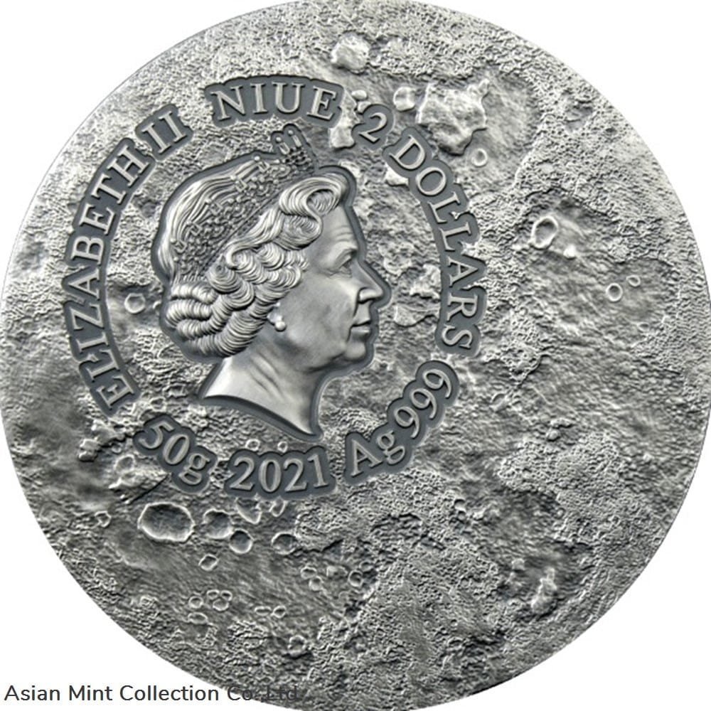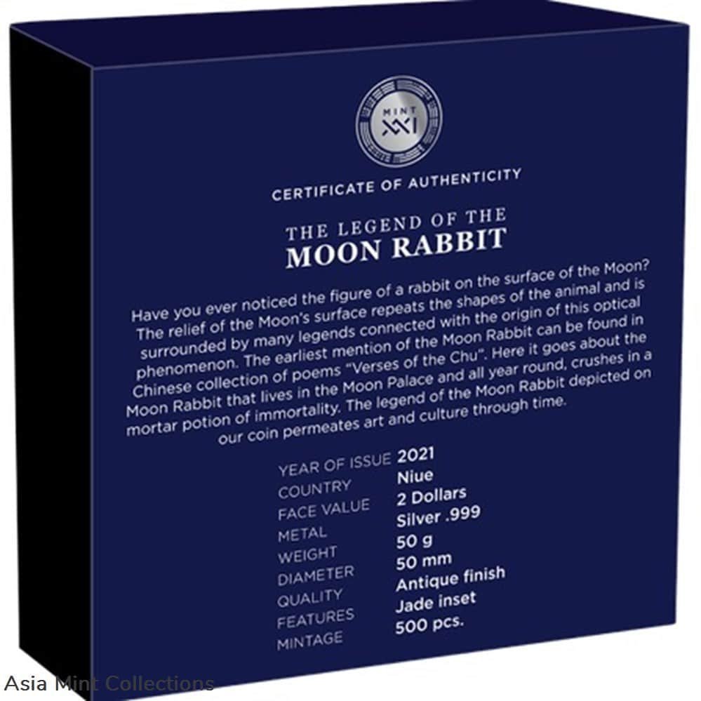 The reverse of the coin features the Moon Rabbit, also known as Jade Rabbit, a mythical figure who lives on the Moon in Far Eastern folklore, based on pareidolia interpretations that identify the dark markings on the near side of the Moon as a Rabbit or Hare. On the reverse, the inscription: “MOON RABBIT” – the name of the coin. The obverse of the coin depicts the effigy of Her Majesty Queen Elizabeth II surrounded by the inscriptions: “ELIZABETH II” – the name of the Queen, “NIUE” – the issuing country, “2 DOLLARS” – the face value, “50 g Ag 999” – the weight and the fineness of the Silver and “2021” – the year of issue.