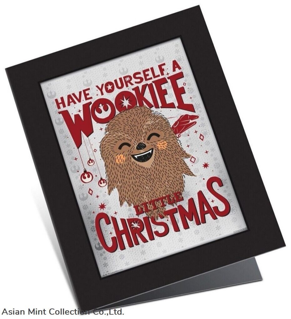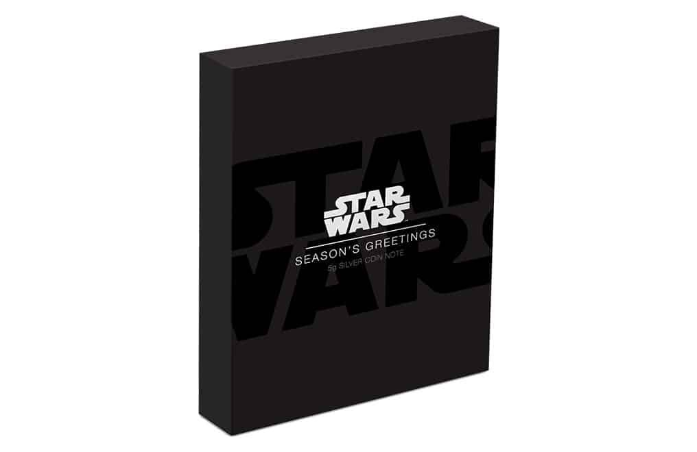 Officially licensed, the note sits within a unique holder designed like a Christmas card. Inside is an illustration of Chewbacca holding his gift, accompanied by the humorous words “Arrrrrrgh! Socks again”. This, in turn, is packaged inside a high-quality, Star Wars-themed box. The unique production number is also detailed on the coin note.