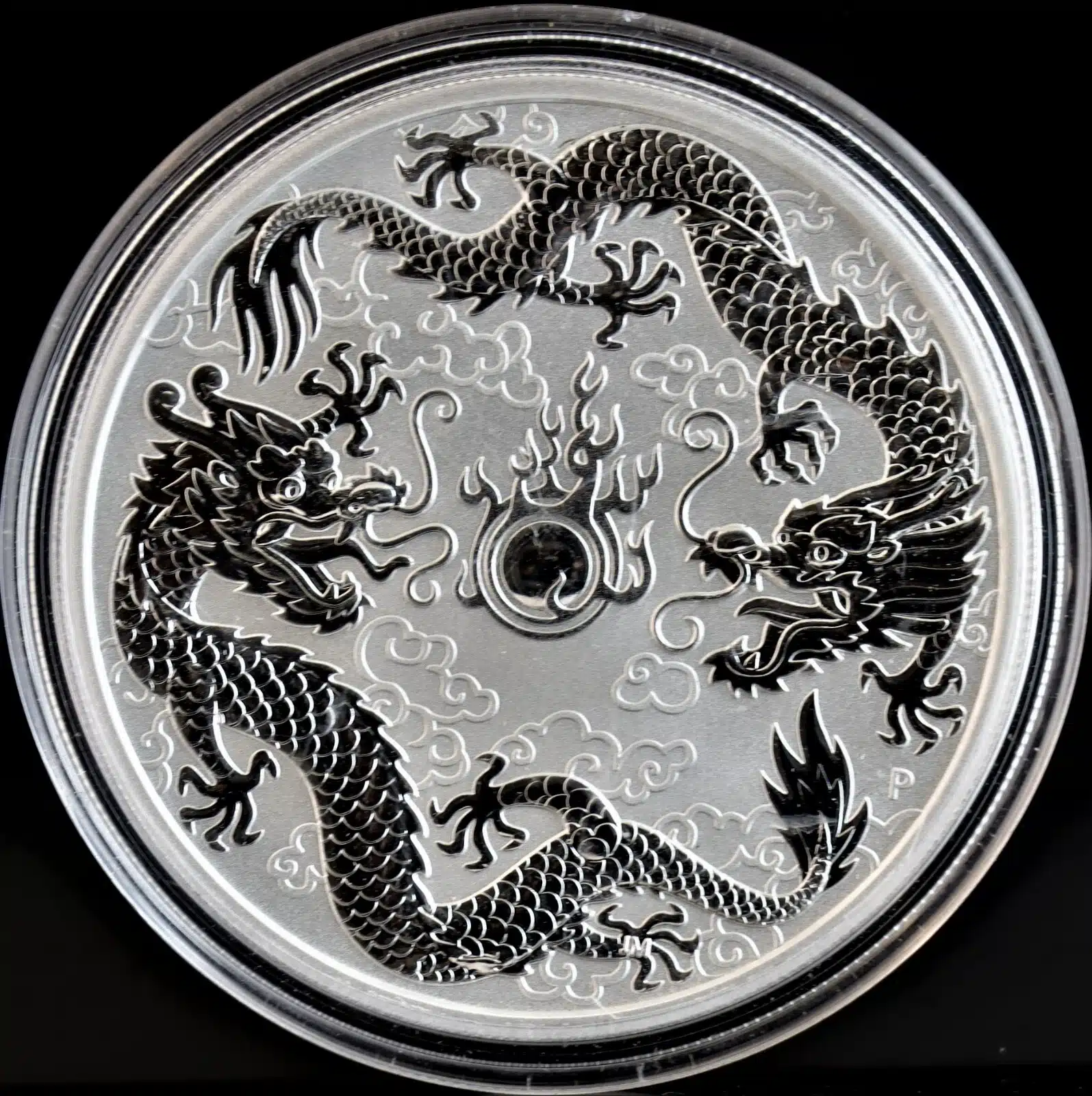 Reverse: The reverse bears an intricately detailed rendering of the Dragon King. He has features that are similar to those of a lion, and his open mouth appears menacing. His eyes have a “fire gold” tint that renders the image particularly engaging.