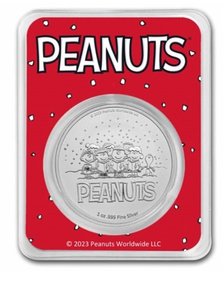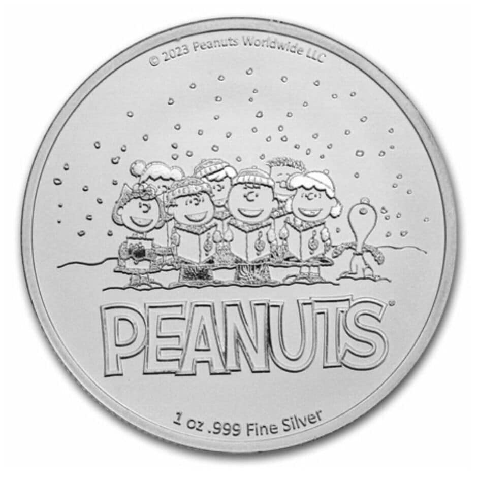Reverse: Displays the officially licensed struck image of the PeanutsĀ® logo above which Sally Brown, Linus Van Pelt, Charlie Brown, Lucy Van Pelt and Snoopy all sing Christmas carols in the snow alongside other PeanutsĀ® characters. Below is the metal weight and purity.