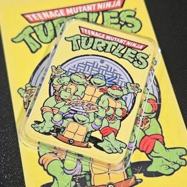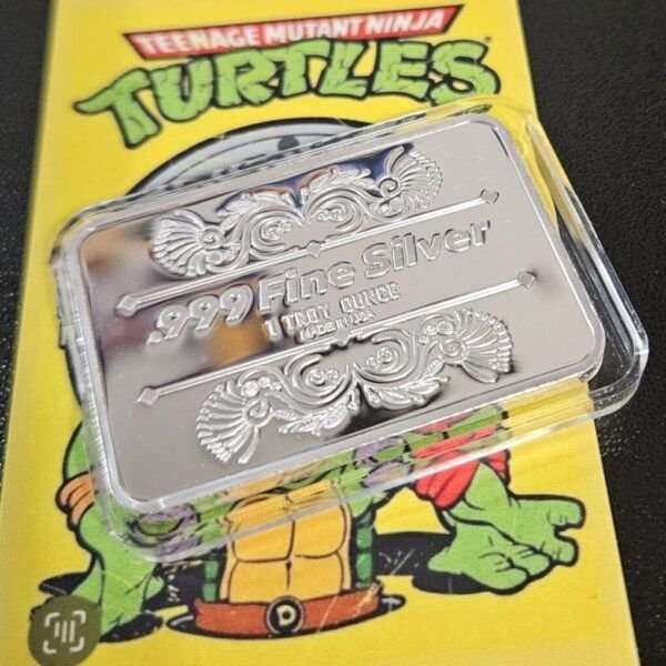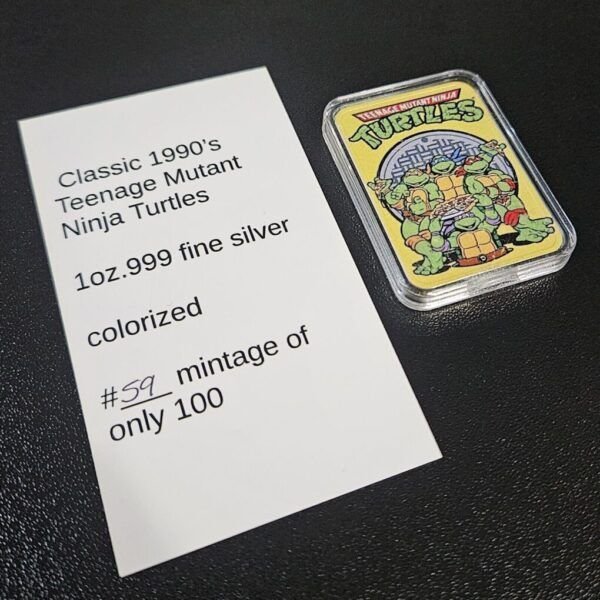 Cool piece! Rare find..Only 100 minted.. SERIAL #7 out of only 100 – Classic 90’s Teenage Mutant Ninja Turtles- 1 troy oz .999 fine Silver Full colorized art bar in capsule w color COA card.