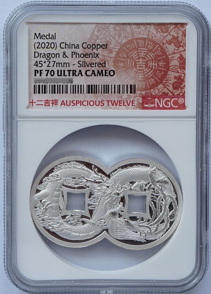 2020 – NGC MS70 China copper dragon & phoenix 45*27mm Silvered medal