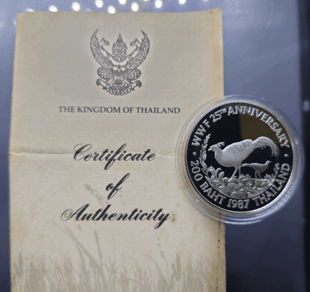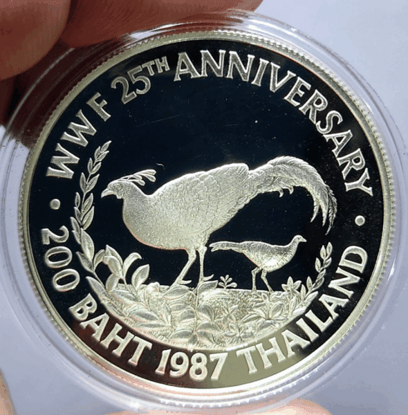 200 Baht polished silver commemorative coin, 25th Anniversary of the World Wildlife Fund, Pheasant design, 1987, with certificate. Excellent condition.