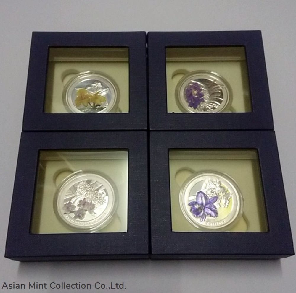 Commemorative Coin Thailand Orchids, Color Printed in polished silver, set of 4 coins