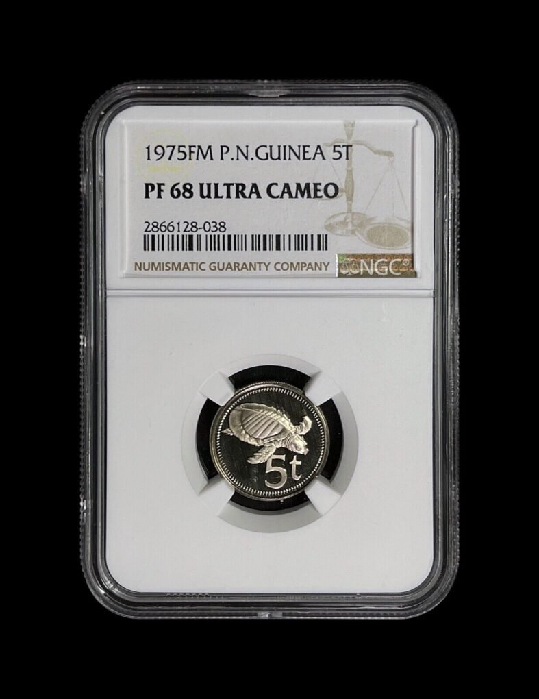 1975 – PAPUA NEW GUINEA. 5 Toea – NGC PF68 – Pig-Nosed Turtle 🐢