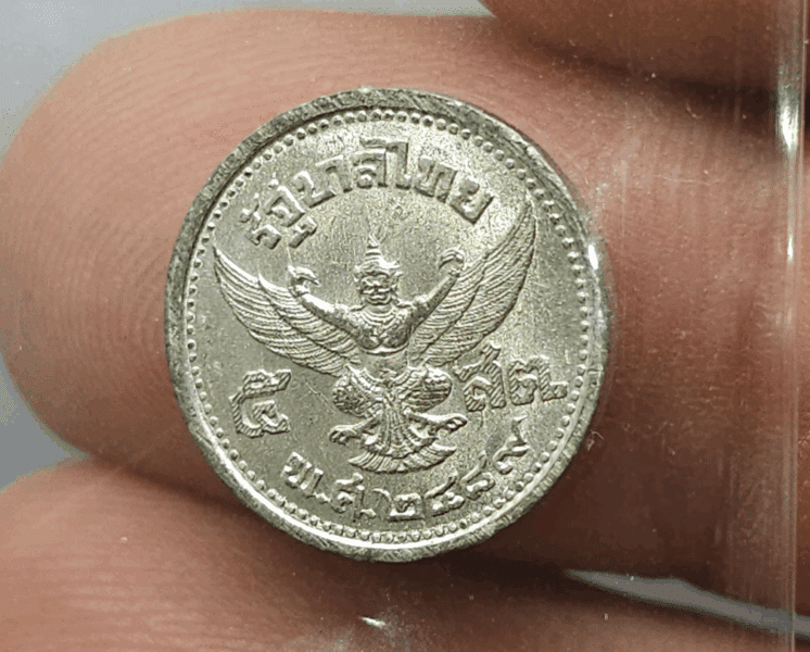 Diameter 1.50 centimeters, approximate weight: 1.28 grams, thickness 0.12 grams, announced for use in 1946. Front – A half-length image of King Ananda Mahidol as a young man, wearing full civilian uniform, facing left. On the left edge is the royal cypher “Ananda Mahidol” and on the right edge is the inscription “Rama VIII”.