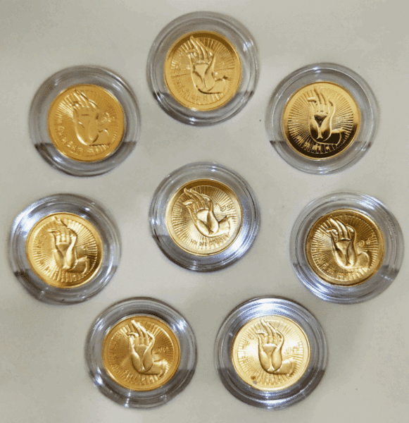 A set of 8 commemorative coins, 8 days of birth, made of cupronickel, gold plated, packed in a leather box with a certificate from the Treasury Department.
