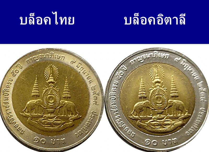 Set of 2 coins, 10 baht, two colors, Kanchanaphisek, Rama 9, Thai block and Italian block, year 1996, unused.