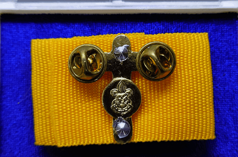 Golden Jubilee pin on yellow silk cloth, created on the occasion of the 75th birthday of King Rama IX in 2002, with original case, guaranteed authentic.
