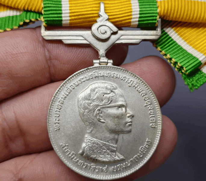Medallion decorated with ribbon, King Rama IX, commemorating the 25th anniversary of the accession to the throne, 1971, silver (female model)