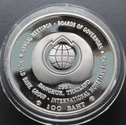 100 baht coin, polished nickel, World Bank, commemorative of the meeting of the Board of Governors of the World Bank and the International Monetary Fund, 1991, with certificate and leather box.