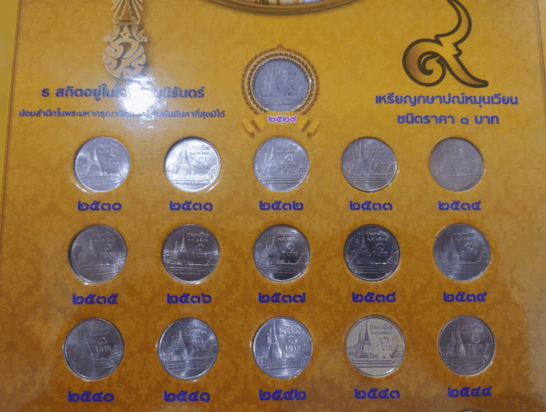 Complete set of circulating 1-baht coins, featuring the Phra Sri Rattana Chedi on the reverse, from the reign of King Rama IX. (Note: the 1986 coin is circulated, while coins from 1987-2017 are uncirculated.)