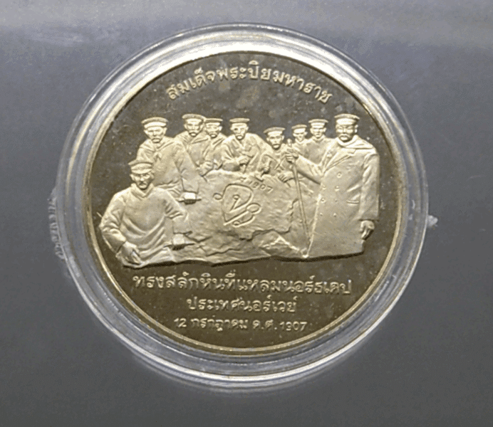 Commemorative polished coin of King Rama V, carved in stone at North Cape, Norway (double-sided) 1907-1997